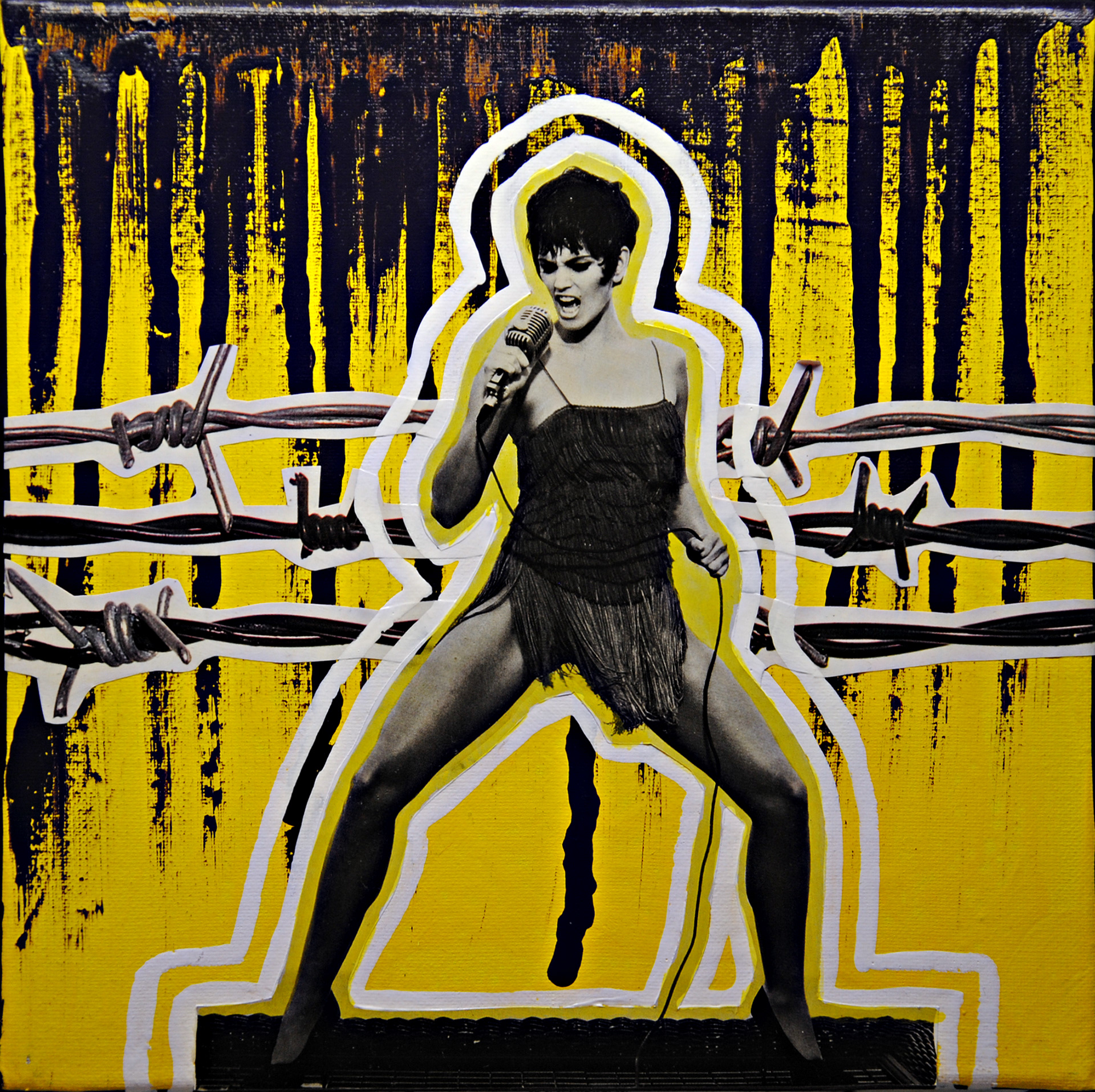 Le figure, ritagliate e contornate da linee fluo che le isolano dal fondo pittorico materico e vibrante, diventano icone laiche, santini pop di una religione visiva fatta di desiderio e spettacolo. Il corpo è superficie esposta, il potere è immagine, la ribellione è estetica, la violenza è linguaggio mediatico, il glamour è costruzione artificiale. L’artista non inventa nuovi simboli ma riattiva quelli che abitano già la nostra memoria visiva, li strappa dal flusso quotidiano e li cristallizza in una forma essenziale, diretta, quasi aggressiva.